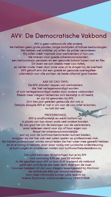 Vanwege de in het algemeen hoge organisatiegraad onder piloten heeft AVV besloten af te wijken van het draagvlakmodel en hier het ledenmodel te gebruiken. Dat wil zeggen dat alleen de leden stemrecht hebben over de cao, en dat de bijeenkomsten van de bedrijfsledengroep een besloten karakter hebben. Bij deze sector wordt een hogere contributie gevraagd.